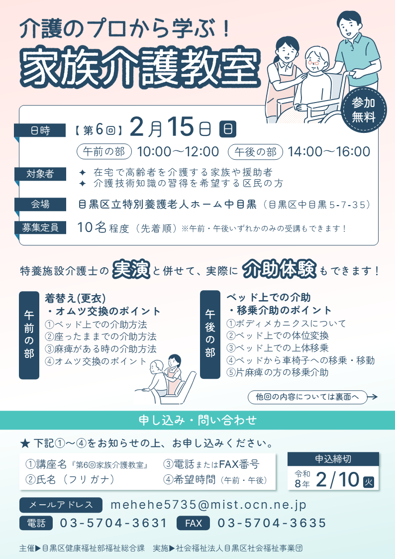 目黒区では、介護者支援の一環として、区立の特別養護老人ホームにて「家族介護教室」を開催しています。