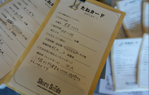 種を入れた袋にはニックネームやメッセージが書かれ、受け取った人はノートにメッセージを書き残します。どちらにもあたたかい想いが込められ“人とのつながり”を実感しながら、想いが紡がれていくのが分かります。