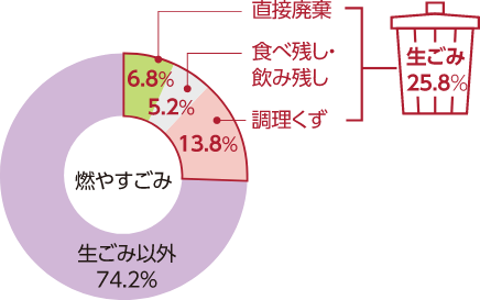 区が令和4年度に実施した家庭ごみ組成分析調査では、燃やすごみの中では生ごみが最も多く、25.8パーセントでした。食品ロスに該当する直接廃棄と食べ残しは、それぞれ6.8パーセントと5.2パーセントで、生ごみの約半分が食品ロスという結果に。このまま増え続けると、食料危機や環境問題に拍車をかけることになります。食品ロス削減のためには、一人一人が食べ切る・使い切る意識を持つことが大切です。