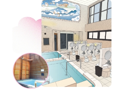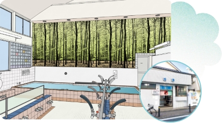浴室には木々が描かれ、昔ながらの高い天井と広い湯船で、足を伸ばして開放感を満喫できます。ミストサウナを入浴料のみで利用できるのもうれしいところ。都立大学駅から徒歩1分とアクセスも良好で、ランニング中の荷物を預かるサービスは駒沢オリンピック公園を走るランナーに好評です。