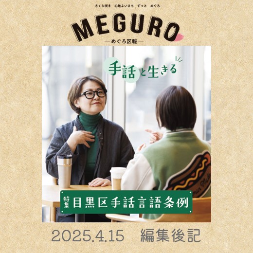 めぐろ区報4月15日号編集後記「目黒区手話言語条例 手話と生きる」(令和7年4月15日公開)