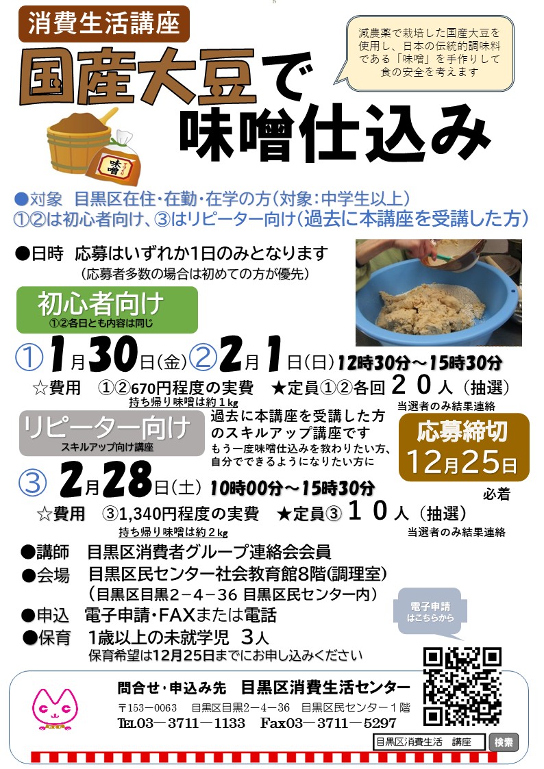 手作りの実践を通して食の安全・安心、食料自給率を考える講座です。平成14年から実施しており、毎年、好評をいただいている講座です。今年度からリピーター向けの回を設けましたので、ぜひご参加ください。